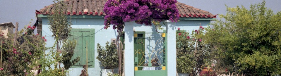 On the road: blue house and honeysuckle